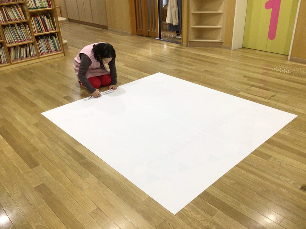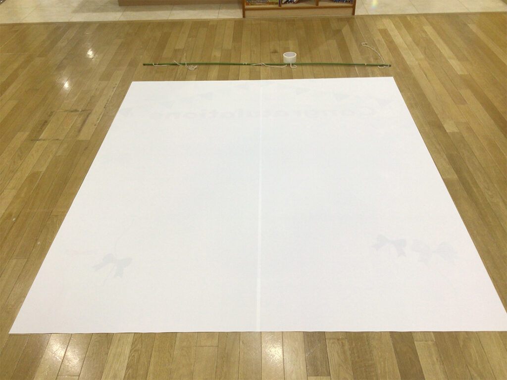 小名木川保育園さんの場合、もともと手作りのPhotoSpotを作成して活用してました。その経緯から、タコ糸を引っかける環境が整っていましたので大変楽に掲示できました♪