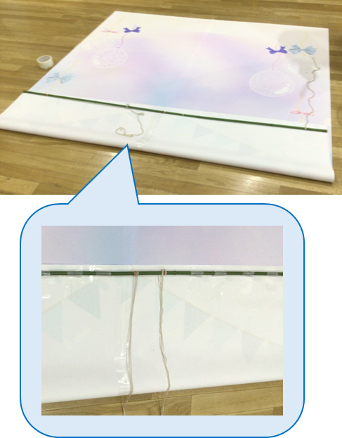 ②繋ぎ合わせたポスターを表に返し、裏面上部にイボ支柱を貼り付けます。